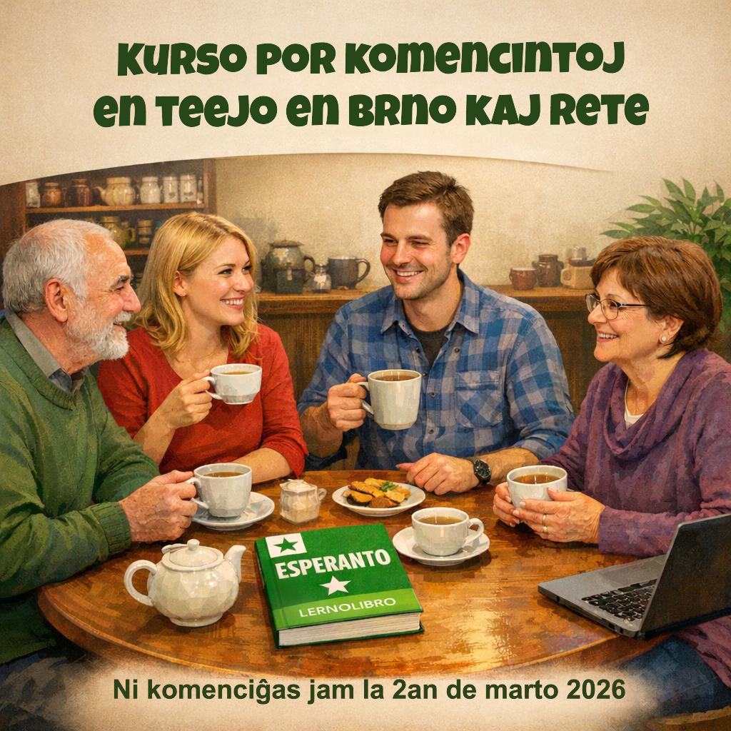 Kurso por komencantoj finiĝas en februaro 2026. La gestudentoj volis daŭrigi. Ni renkotados en teejo Za zrcadlem en Jaselská strato kaj rete (unu semajnon en teejo kaj la sekvan rete).